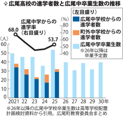広尾中の卒業予定者数は、今後5年間は40人以下が続く見通しで、現状の地元進学率が続くと広尾高入学者数は毎年20人以下となり、「厳しい数字」(町教委)となる。保護者や生徒が望む学力向上の要望に応えられるのか、高校存続の試金石として、公設民営塾の動向が注目されている。