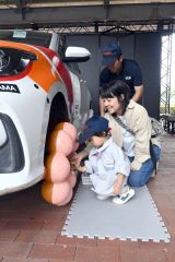トヨタのブースでは、トヨタ技術会有志によるタイヤ交換体験が大人気。子どもたちが整備士とおそろいの作業着を着て、発泡スチロールでできた実物大のタイヤを実車に取り付けた。スタッフの手ほどきを受けながら、ナットでタイヤを固定する作業に夢中で取り組んでいた。