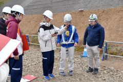 学級委員長の小田愛琉さん(13)は「改良土を触ったりドローンを操縦できたりして楽しかった」と感想を話した。見学会終了後、ドローンで集合写真を撮影し、生徒たちには同協議会から記念品が贈られた。(津田久美通信員)