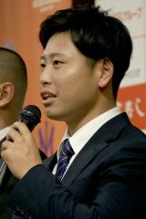 • ドラフト会議終了後に行われた記者会見で決意を語るオイシックス新潟の牧野憲伸(チーム提供)