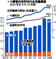 内閣府のまとめによると、2024年末時点の十勝管内町村議員に占める女性議員の割合は19・4%と、全国平均(14・1%)より高かった。帯広市を含めた管内の女性議員数は48人で、直近10年間で1・5倍に増えた。管内でのトップは幕別町の44・4%(8人)で全道2位、全国11位。一方、女性議員ゼロも4町ある。(佐藤いづみ)
