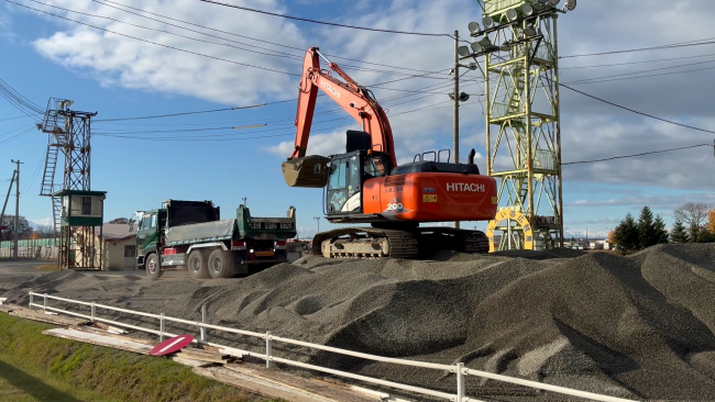 砂障害の砂利をトラックに移す作業を行う重機