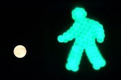 この日の帯広の月の出は午後3時39分。日の入りも午後4時16分とすっかり早まり、大きな月が夜空の主役に。帯広市内の中心部では、帰宅を急ぐ会社員はコートを羽織り、すっかり冬の装い。ふと横断歩道を見上げると、点灯した青信号と満月が重なり、サッカーをしているように見えた。(塩原真)