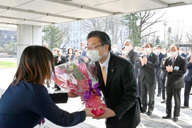 米沢市長は午前8時20分、公用車で市役所正面玄関に到着。集まった150人近い市職員や市議会議員に拍手で出迎えられ、女性職員から笑顔で花束を受け取った。