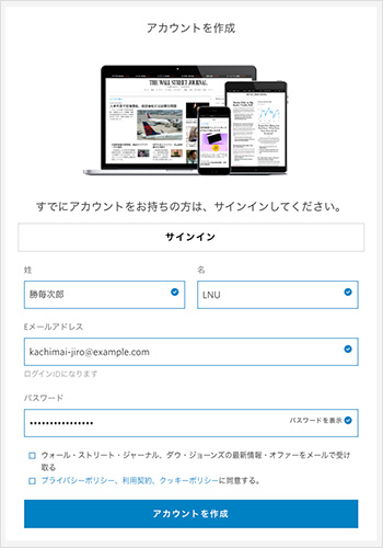 WSJサイトのアカウント作成画面に進むと「姓」に勝毎電子版の会員名、「名」に『LNU』、「Eメールアドレス(ログインIDになります)」に、勝毎電子版のログインIDとして使用しているメールアドレスが自動で入力されます。