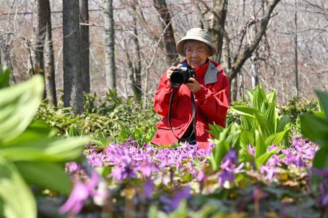 カタクリを撮影する嶋谷暁子さん(金野和彦撮影)