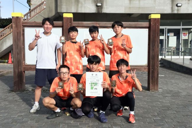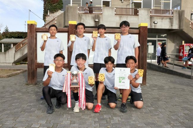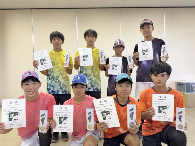 男子個人戦上位入賞者。優勝の望月優太(前列左端)と保住哲平(同左から2人目)ペアは団体戦との2冠を果たした
