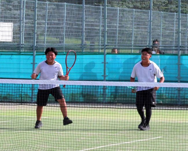 【女子団体戦決勝・音更―帯南町】ポイントを挙げて喜ぶ音更の(左から)山本美空・山田帆栞組