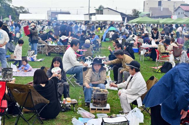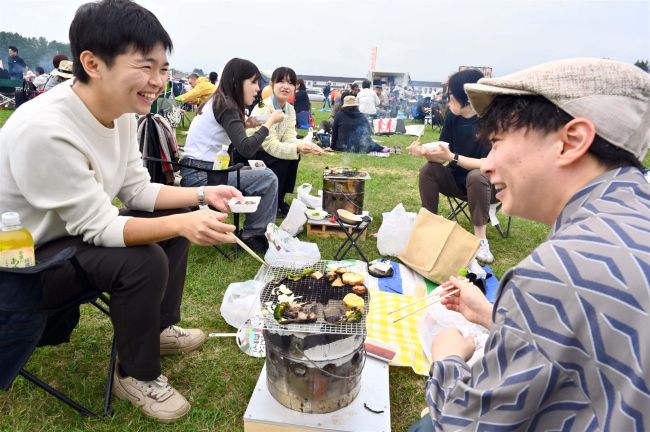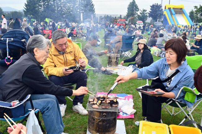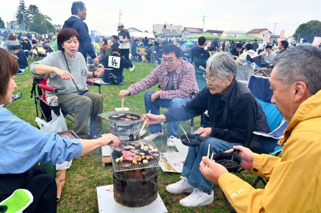 炭火台を囲み、ニンニクと十勝産の牛肉を味わう来場者(4日、午前10時半ごろ、清水町内のホクレン清水製糖工場広場で。金野和彦撮影)