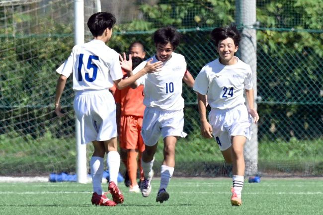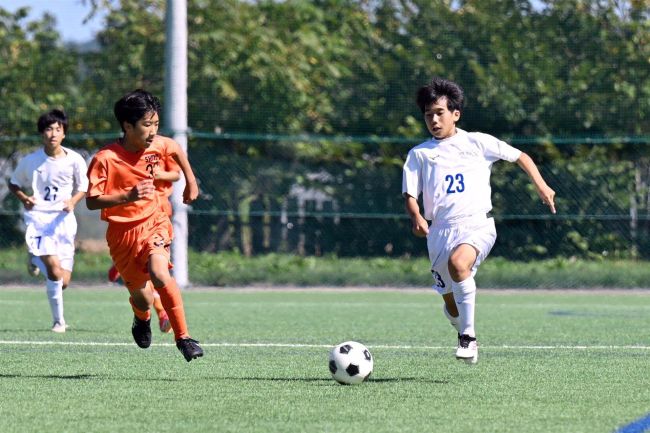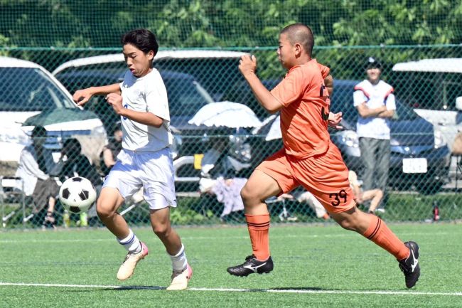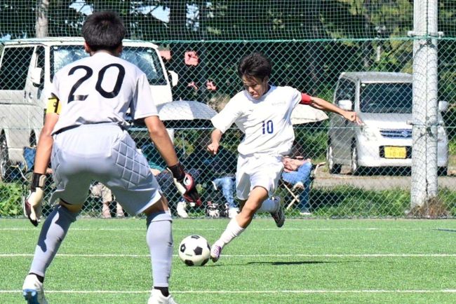 【決勝・帯南町―帯翔陽】前半16分、帯南町の福岡慶大が相手のクリアボールをカットし、ミドルシュートで先制点を決める