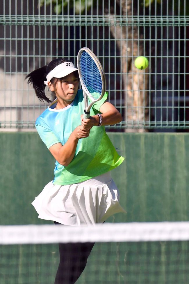 【女子団体代表決定戦・帯大谷-開成中等】激しいストロークを打ち込む帯大谷の三崎心愛