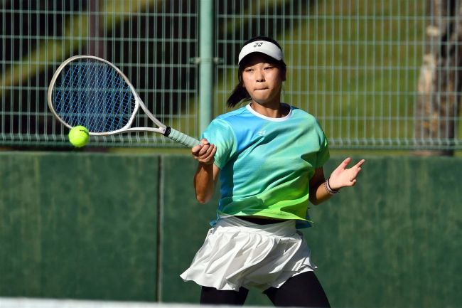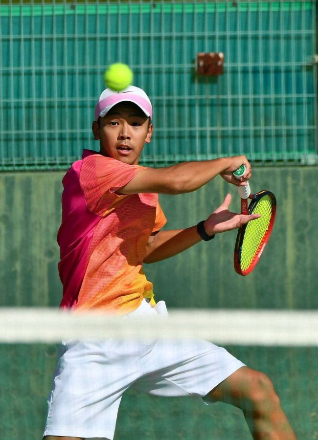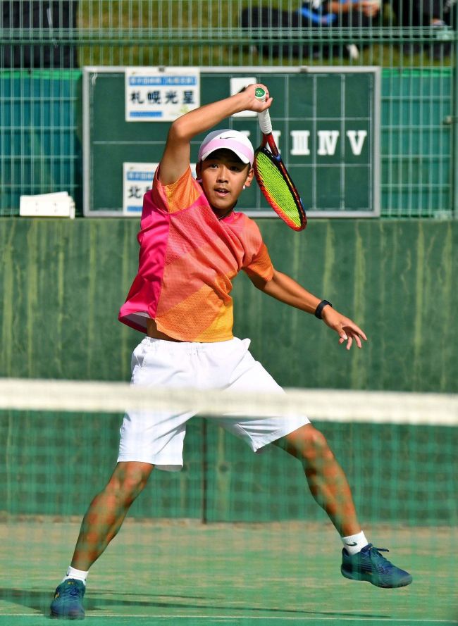 【女子団体代表決定戦・帯大谷-開成中等】高い打点でボールを叩き込む帯大谷の宮本陽稔。6-0のストレート勝ちでチームに流れを引き寄せた