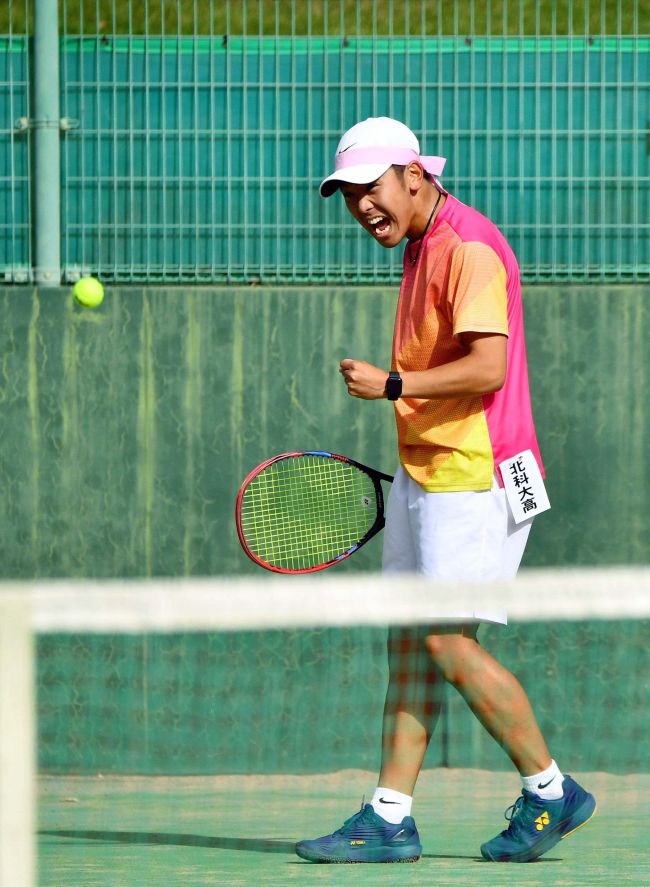 【男子団体準決勝・道科学大高-札幌光星】ポイントを決め雄たけびを上げる道科学大高の熊倉新太