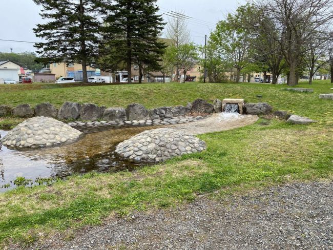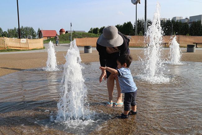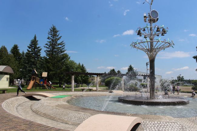 音更町内で最大級の水遊びスポット。シンボルの大きな噴水のほか、西側の壁泉からつながる長い遊水路が子ども心をくすぐる。