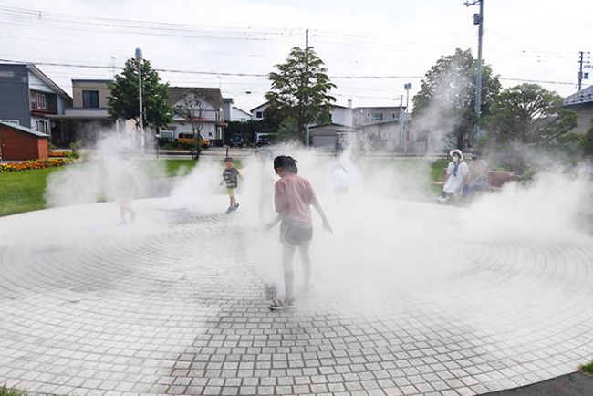 モクモクと立ち上がるミスト噴水が涼しげな広場。ため水がないので子どもたちの洋服がずぶ濡れになりづらいのもポイント。