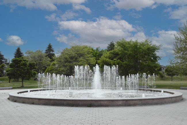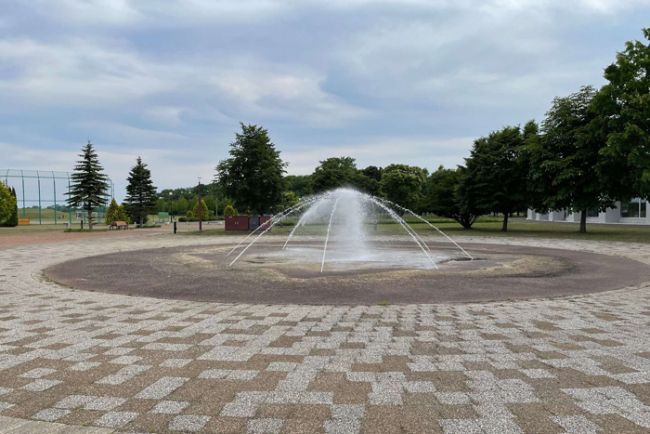 運動公園多目的広場に隣接。昨年自然石舗装に改修した噴水池は、池の中央から外、外から中心に向けて放射状に水が出る。