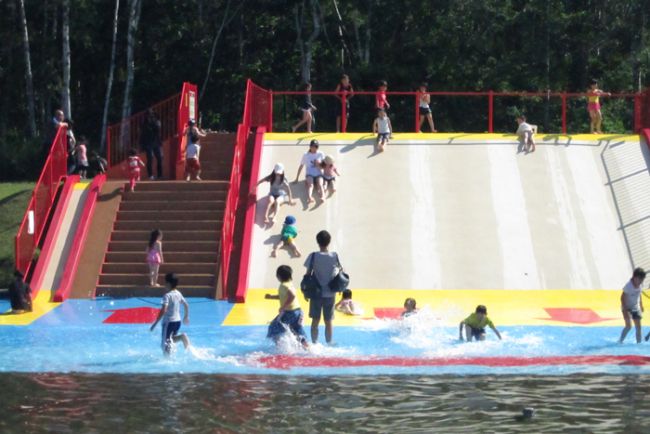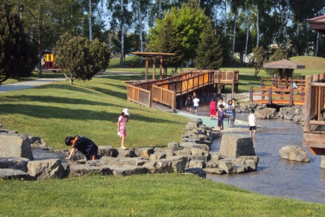 長い遊水路、池、噴水などを用意。水深もさまざまなので幅広い年齢の子どもが遊べる。芝生でピクニックするのもお勧め。