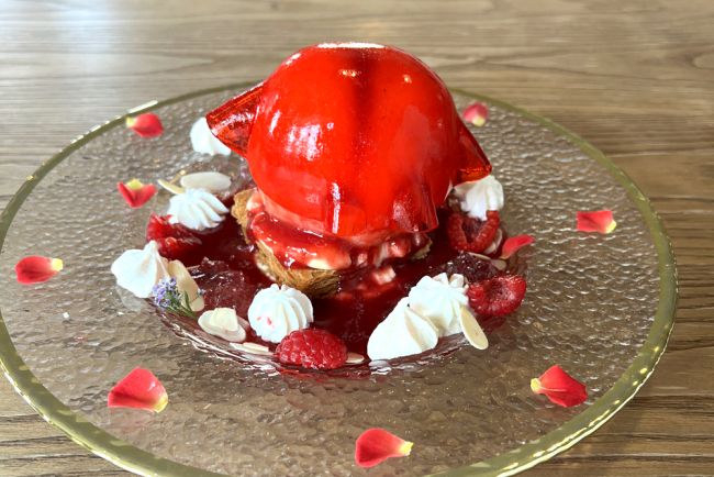 取材時は桃の季節だったので、丸ごと使った桃は真っ赤なドレスゼリーをまとい、エディブルフラワーのじゅうたんの上に鎮座。「食べるのがもったいなーい」と言いつつ、しっかり食べますよ。絞ったシャンティクリームと思ったらココナッツメレンゲだったりという、遊びゴコロもうれしい。コーヒー〈コロンビアキョート〉(深煎り)が、ビターな味わいで合いますネ〜。