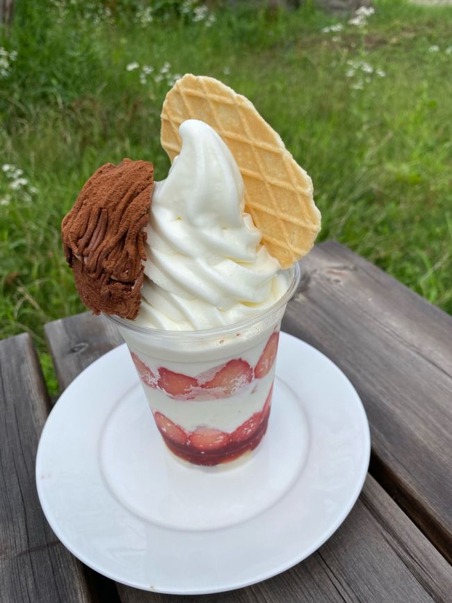 毎年初夏から店頭に並び、好評を集めているのが〈イチゴランド〉。幕別町札内の農家「十勝いちごこち」のイチゴをはじめ、スポンジ生地、生クリーム、イチゴのコンフィチュールなどを重ねた一品だ。ソフトクリームをトッピングした〈イチゴランドパフェ〉を、さらに進化させたのが今月のChaiスイーツ。ハーフサイズの「チョコモン」とクッキーをのせて、ボリューム満点の仕上がりに。