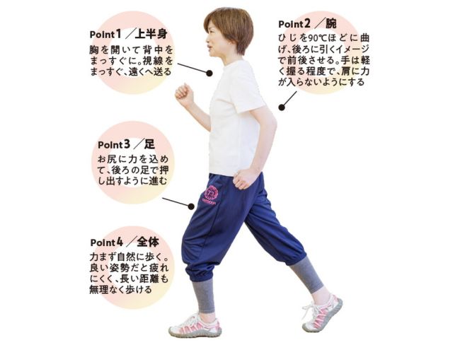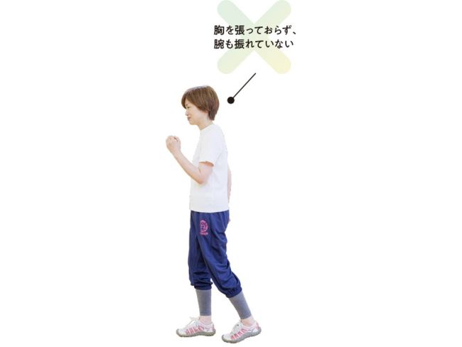 腕を大きく振れるようになると、自然と胸が開き歩幅も広がって良い姿勢をキープできます。足に意識が向きがちですが、まずは腕の動きに気を配りましょう。
