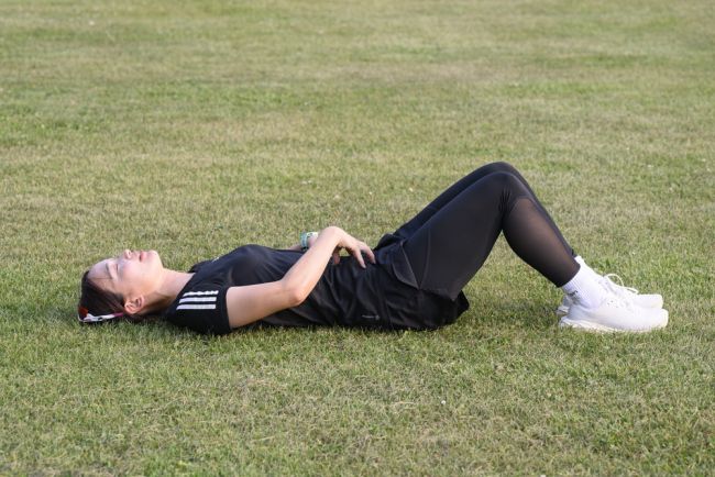 仰向けに寝た状態でひざを立てる。息を深く吸った後、肺の中を空っぽにする意識で息を吐き切る。腹の腰骨の内側を触りながら、腹の筋肉が動いているか確認しながら行う。腹圧を高めると体幹が安定しやすくなる。