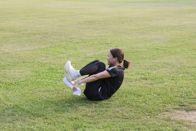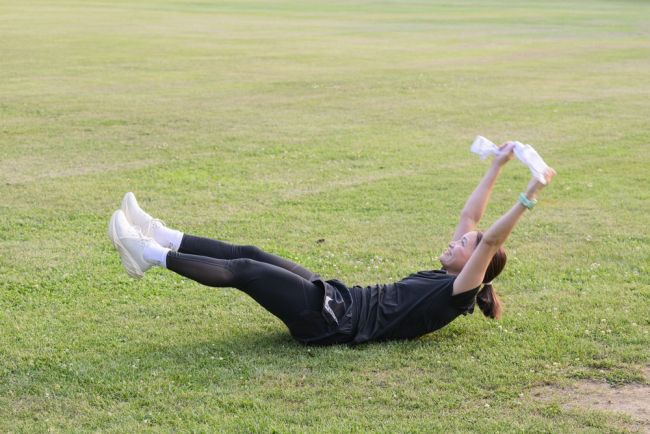 仰向けに寝た状態で、タオルを持ち、万歳の姿勢をとる。上半身を起こし、曲げた足に通して戻す。目標は連続10回。
