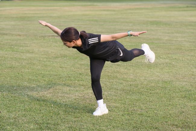 両腕を開いて前かがみになり、Tのポーズを作る。軸足がぶれないように30秒~1分キープする。