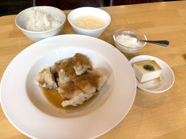 昨年オープンする際、事前にチェックしていた笑場。初訪時に頼んだ〈ルーローハン〉は、スパイスが効いた軟らかいバラ肉が、甘じょっぱく濃いたれに絡む”白米ドロボー“。取材時には人気の〈油淋鶏(ユーリンチー)定食〉を用意してもらいました。モモ肉に良く合う「甘酢玉ねぎソース」の酸味で、サッパリといただけます。ランチの定食すべてに杏仁豆腐が付くのもうれしいですね。