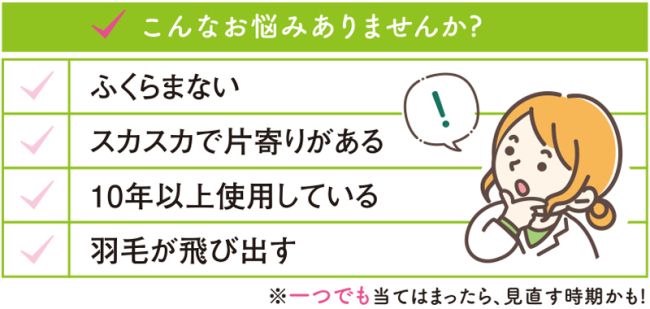 羽毛ふとんの寿命は約10年。劣化した羽毛ふとんは、片寄りが起きたり、保湿性が低くなり、軽くて暖かい羽毛ふとんの魅力がなくなってしまいます。「毎日使うものだからこそ納得のいく物を選んで欲しい」と帯広市内の西川チェーン店「アットホームおおた」に羽毛ふとんの選び方を教えてもらいました。