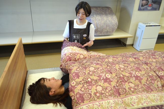 「居住環境」「室温」「体質」などあらゆる条件を考慮しながらお客さまに合う商品を提案します。それができるのも豊富な専門的知識とふとんの種類を取り揃える専門店だからこそ。気になる点があれば、まずは専門家に相談を。購入後の無料相談メンテナンスなどアフターケアもバッチリです。