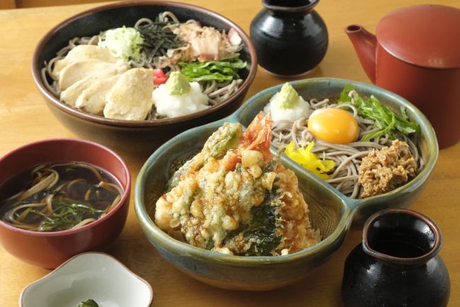 昼時には行列ができ、町内外から足繁く通うファンも多い。風味や栄養価が高い全粒粉のそば粉を使用。創業当初から使う自家製のかえしとかつお節や昆布でとっただしを合わせたそばつゆが麺とよく絡む。注文に迷ったら好みのそばや丼を組み合わせられる〈アベック丼〉をぜひ。