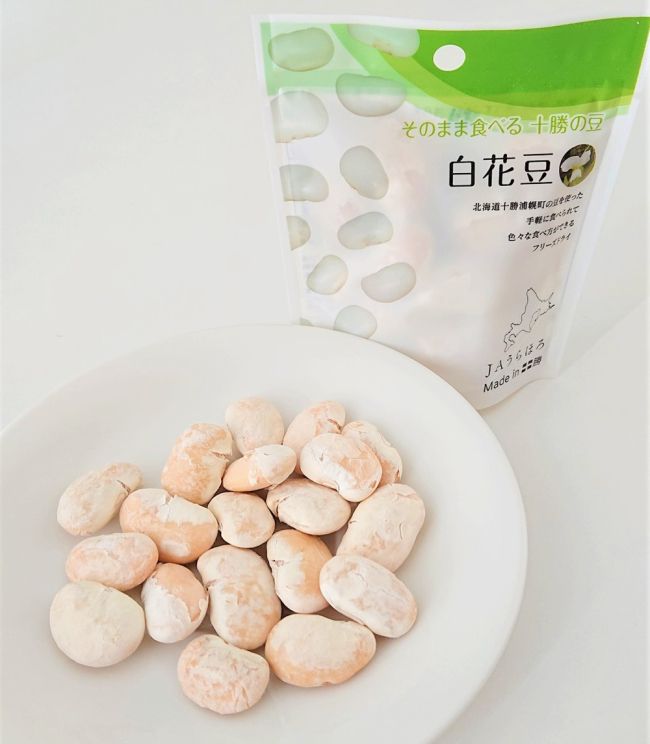 フリーズドライ製法で、十勝の豆をそのまま食べられるサクサクの食感に加工した。黒大豆、金時豆、白花豆はほんのり甘く、青大豆は優しい塩味。水で戻せば料理にも活用できる。