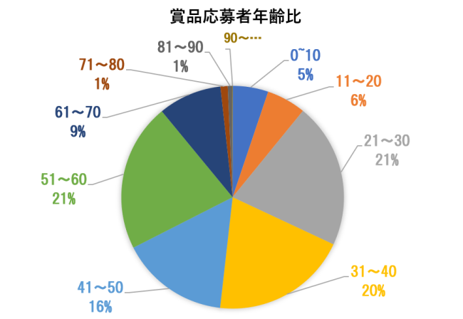 参加年齢は幅広く、0才(⁉)から92才の方々に賞品ご応募をいただきました。年代ごとに見ていくと、例年と同傾向で20代~50代がほぼ同比率の参加者数でした。